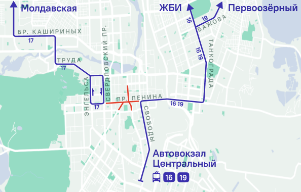 - № 17: Молдавская — Молодогвардейцев — Братьев Кашириных — Труда — Свердловский проспект — проспект Ленина — Энгельса — Труда — Братьев Кашириных — Молодогвардейцев — Молдавская;