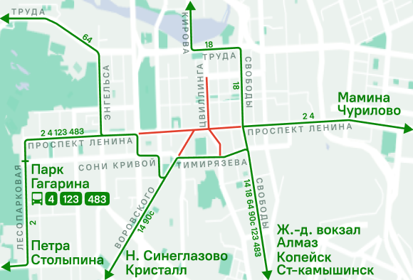 - № 4: Мамина — проспект Ленина — Свободы — Тимирязева — Воровского — Красная — Сони Кривой — Свердловский проспект — проспект Ленина — парк Гагарина;