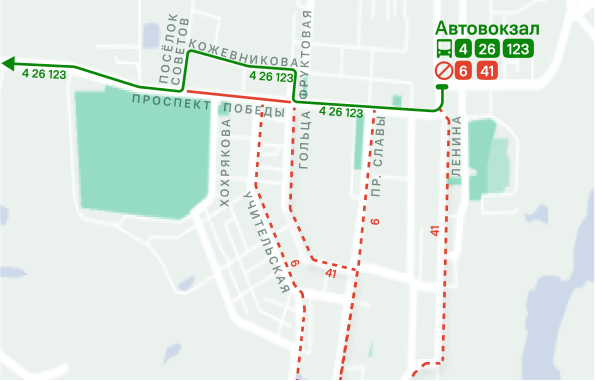 - № 26: автовокзал — проспект Победы — Фруктовая — Кожевникова — поселок Советов — проспект Победы — Октябрьский;