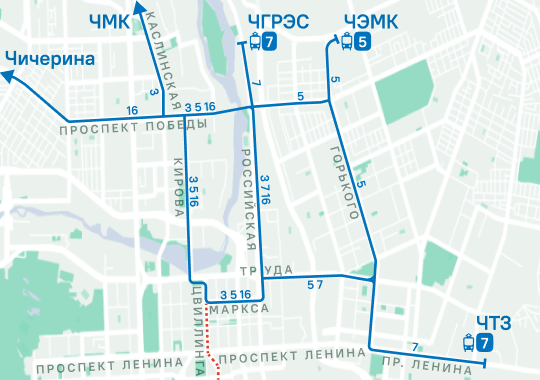 - № 7: ЧГРЭС — Российская — Труда — ЧТЗ;