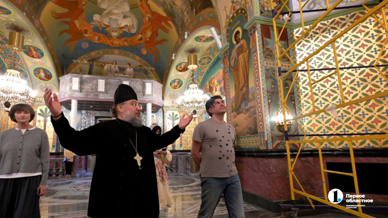 Следующей точкой знакомства с Челябинском как раз стал храм Александра Невского, где завершается реставрация. Николай Цискаридзе осмотрел иконостас и купель для взрослых, оценил акустику в обновленном храме и сами росписи, сделанные по эскизам Виктора Васнецова.