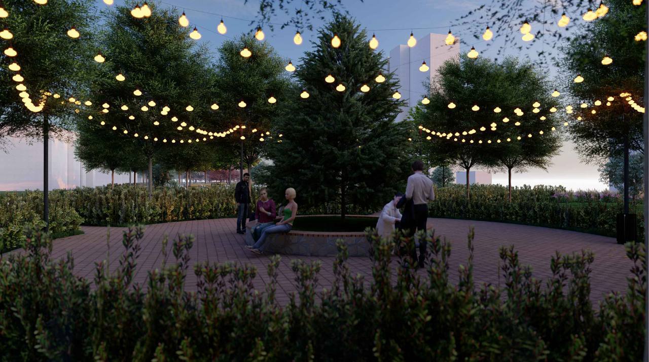 В западной части сквера будет «событийная площадка»: в центре уже высадили ель, рядом сделают скамейку и повесят гирлянды, чтобы жители домов могли собираться здесь на праздники.