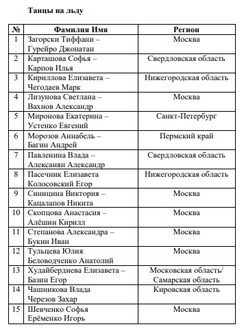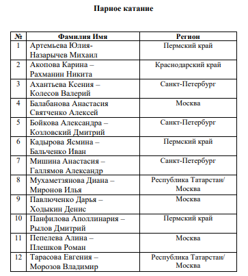Помимо списка участников женского и мужского одиночного катания федерация опубликовала и список спортсменов во всех остальных дисциплинах. В танцах на льду за титул чемпиона России поборются 15 пар, ещё 12 выявят сильнейших в парном катании.