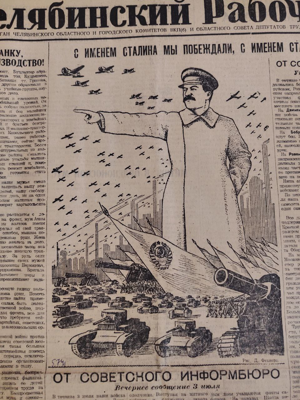 «Вероломное военное нападение гитлеровской Германии на нашу родину, начатое 22 июня, — продолжается. Несмотря на героическое сопротивление Красной Армии, несмотря на то, что лучшие дивизии врага и лучшие части его авиации уже разбиты и нашли себе могилу на полях сражения, враг продолжает лезть вперед, бросая на фронт новые силы. <...> Над нашей родиной нависла серьезная опасность»,— приводила слова Иосифа Сталина газета «Челябинский рабочий».