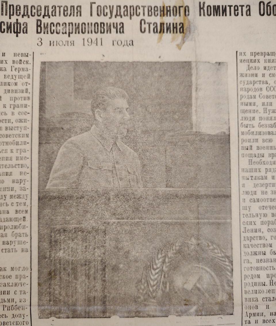 «Дело идет о жизни и смерти советского государства, о жизни и смерти народов СССР, о том — быть народам Советского Союза свободными или попасть в порабощение. Нужно, чтобы советские люди поняли это и перестали быть беззаботными, чтобы они мобилизовали себя и перестроили всю свою работу на новый, военный лад, не знающий пощады врагу»,— заявлял Сталин.