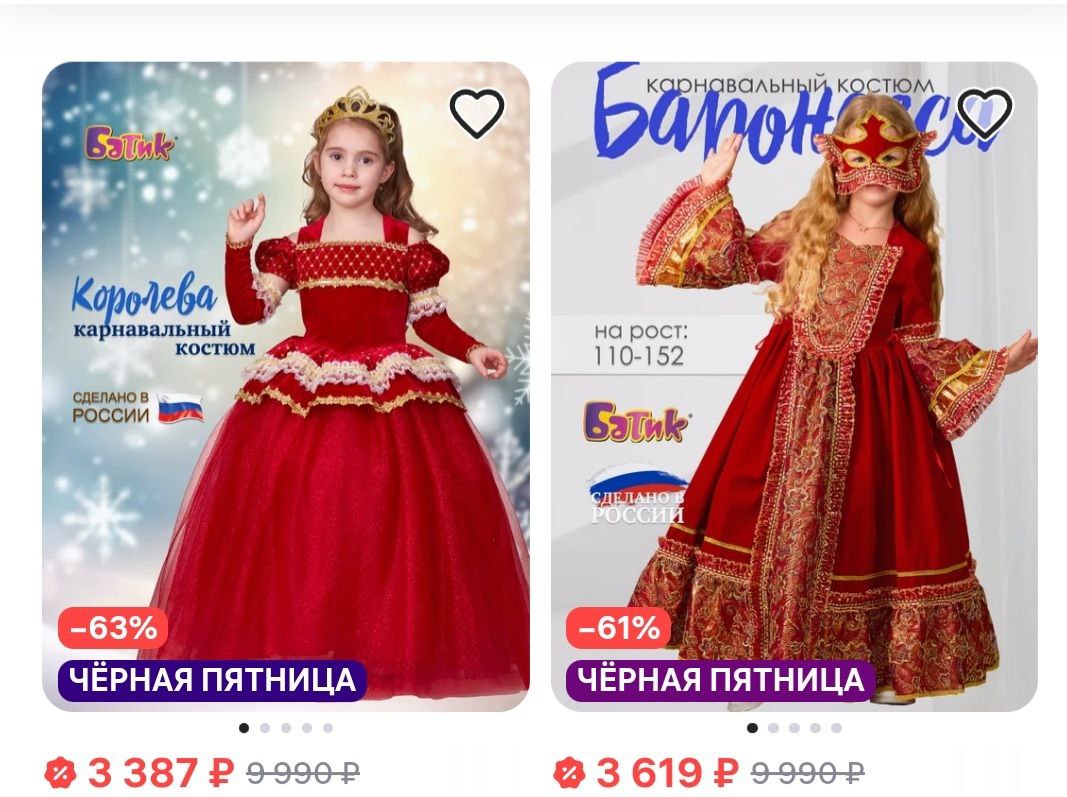 На платформе в регионе представлен широкий выбор карнавальных костюмов. Среди девочек наиболее популярны образы лисички, Снегурочки, принцессы, Эльзы и Красной Шапочки, а среди мальчиков — снеговика, зайчика, пирата, гусара и мушкетера. При этом можно найти и другие варианты: например, костюм белочки для девочки в полном комплекте за 1750 рублей или костюм гномика для мальчика за 900 рублей.