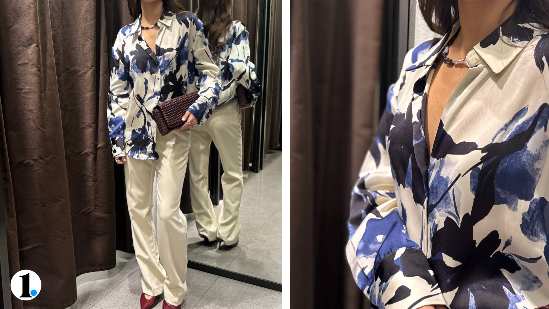 На шее — ожерелье из натуральных камней добавляет образу природной гармонии, а металлическая бижутерия придает легкий блеск. Бежевые брюки (все те же на низкой посадке) выступают идеальным фоном, позволяя акцентным деталям раскрыться в полную силу.