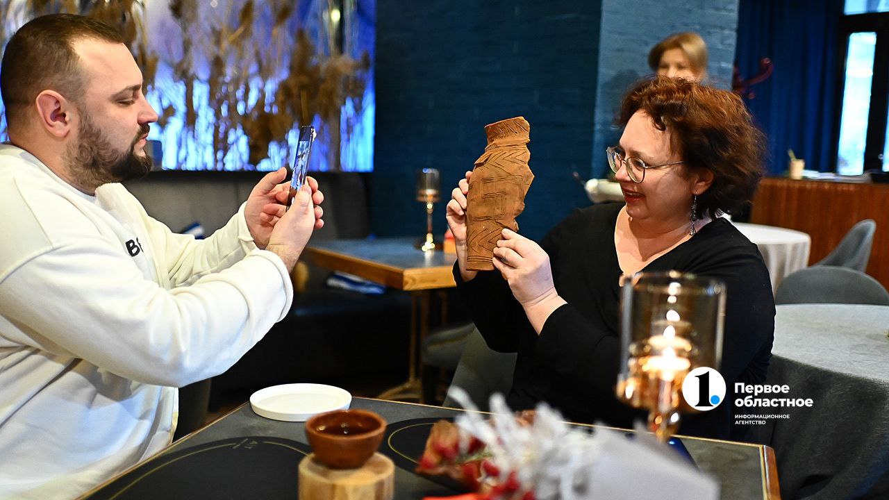 Перед Сергеем ставят блюдо — часть сета «Аркаим»: мясной набор на керамической тарелке — реплике сосуда эпохи бронзы. «Тропа кочевника» символизирует дикую природу вокруг поселения и одновременно рацион древних охотников и воинов.