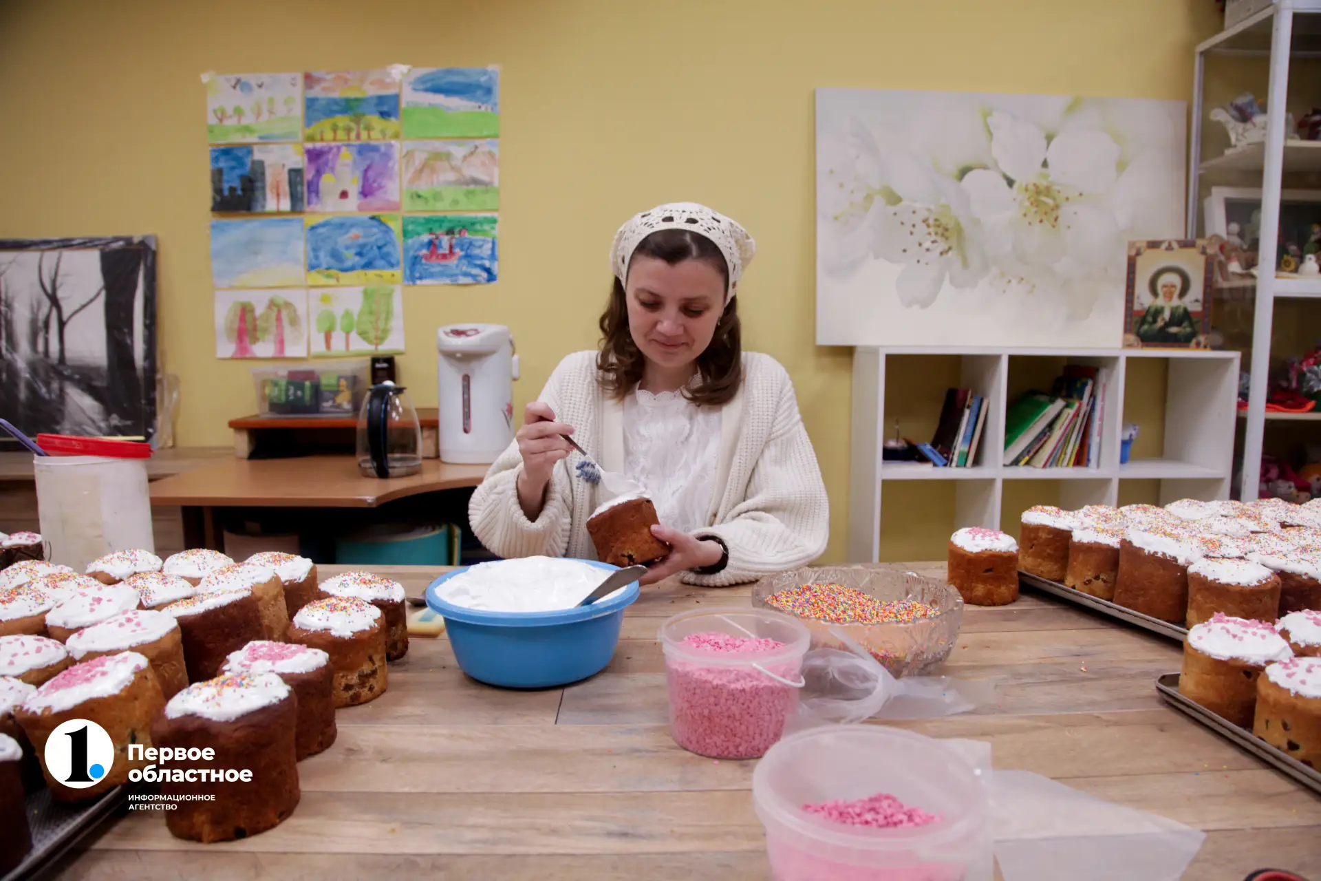 В нижней части храма есть класс, там уже идет процесс украшения куличей.