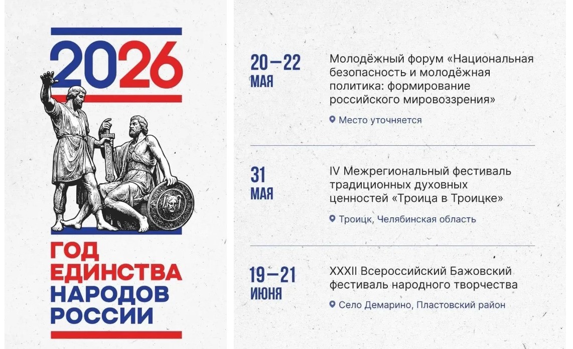 В Год единства народов России на Южном Урале пройдут десятки событий. В своем канале в месенджере МАХ губернатор Челябинской области Алексей Текслер представил ключевые мероприятия 2026 года, среди которых научные форумы — всероссийские и международные, духовные и мультикультурные фестивали и многое другое.