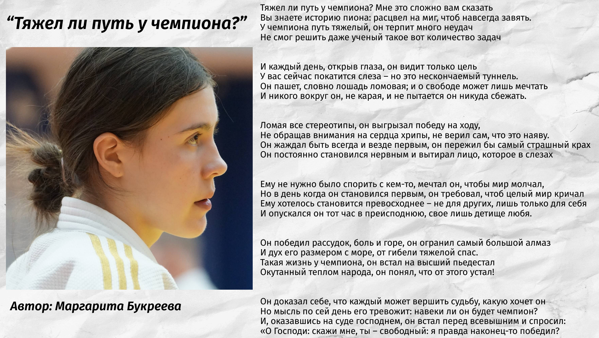 Маргарита Букреева живет в Челябинске, но регулярно ездит на тренировки в родной Еткуль, успевает совмещает занятия спортом с учебой и... литературным творчеством. Девушка описывает в стихах свой непростой путь к вершинам. Накануне она впервые в карьере стала победителем первенства Европы. Мама спортсменки, Юлия Робертовна, рассказала корреспонденту ИА «Первое областное», как дочь шла к этой победе.