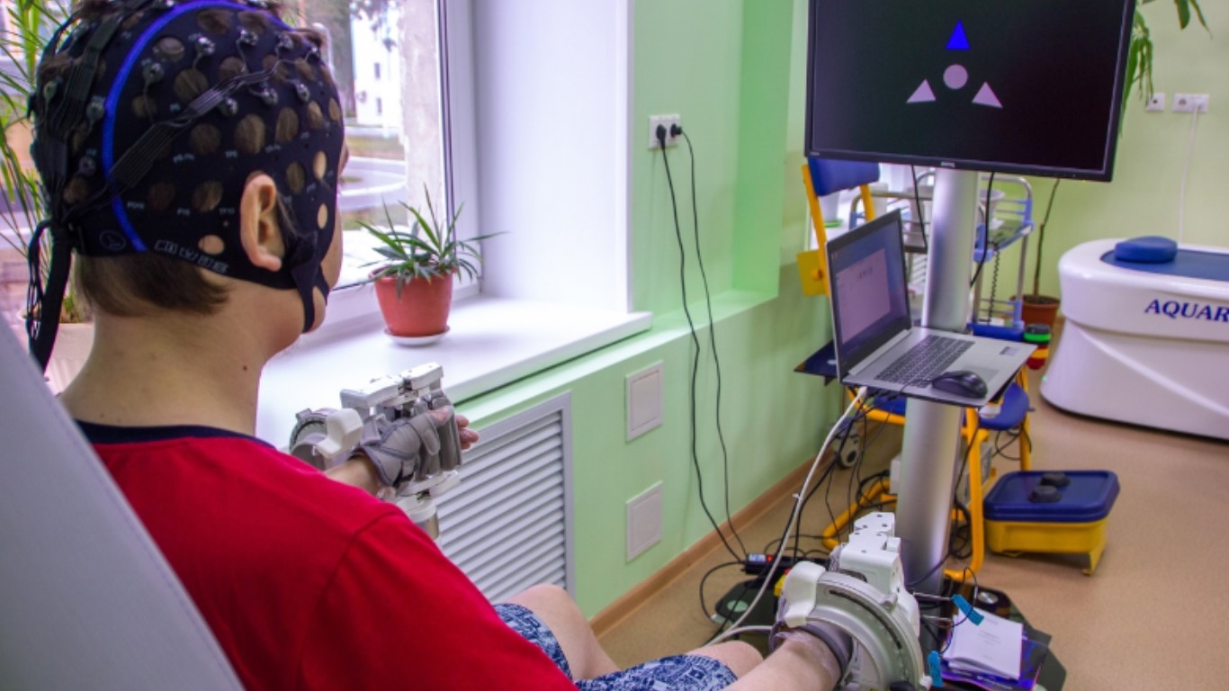 «На экране пациент видит три индикатора. Верхний — индикатор покоя, левый — индикатор для левой верхней конечности и правый — для правой. Когда загорается индикатор покоя, пациент не должен думать про свои руки. Он может, например, мысленно считать от 1 до 10, представлять животных, какие-либо изображения. Когда включается индикатор левой или правой руки, он должен вообразить движение этой рукой. Не подвигать, а именно представить, подумать о нем. Этот импульс считывается по данным электроэнцефалограммы и идет непосредственно в кисть», — рассказывает исполняющая обязанности заместителя заведующего отделением реабилитации ЧОДКБ Наталья Черепанова.