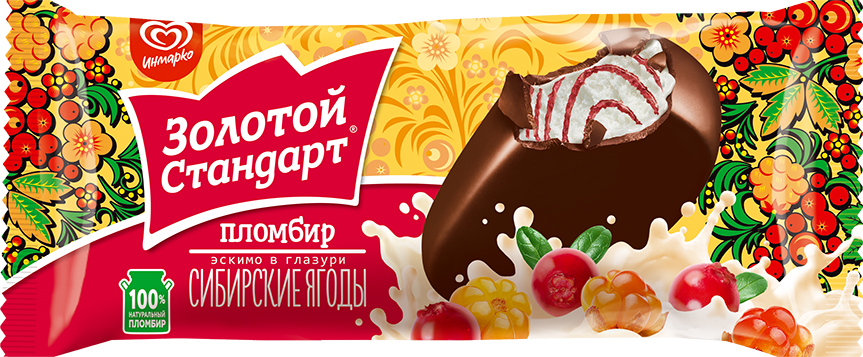 Эскимо «Сибирские ягоды» заслуженно называют новинкой в русском стиле. Для его производства используют уникальный наполнитель из настоящих сибирских ягод: брусники и морошки. Он по праву стал находкой для тех, кто любит и ценит традиционные русские вкусы. Морошка — «королевская ягода», на десерт ей лакомились цари. Брусника была на вес золота из-за поражающего воображения вкуса и полезных свойств. Для того, чтобы отыскать эти ягоды в лесу, придется приложить немало усилий, но любители пломбира всегда смогут найти правильную альтернативу на полках магазинов. Более того, благодаря новым технологиям, в «Золотом Стандарте» сохранились все полезные свойства ягод. Спутать это мороженое не получится ни с чем. Упаковка нового эскимо украшена исконно русской хохломской росписью.