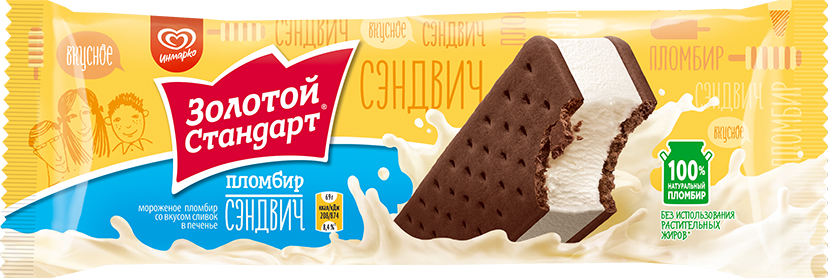 Удивитесь тому, как простое сочетание настоящего шоколадного печенья и 100% натурального пломбира, может привести вас в восторг и стать самым любимым перекусом в течение дня. С пломбиром-сэндвичем «Золотой Стандарт» получится устроить прогулку или просто превратить его в идеальное дополнение к чашке кофе или другого напитка.