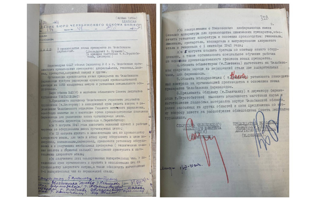 30 июля 1941 года на заседании бюро Челябинского обкома ВКП(б) было принято постановление о немедленном освоении производства целого ряда новых препаратов — для местной анестезии и наркоза, обезболивающих, антисептиков, физраствора, мази от обморожений, которые — военное время! — нужны были в огромных количествах. Это решение стало точкой отсчета для стремительной перестройки и расширения производства.