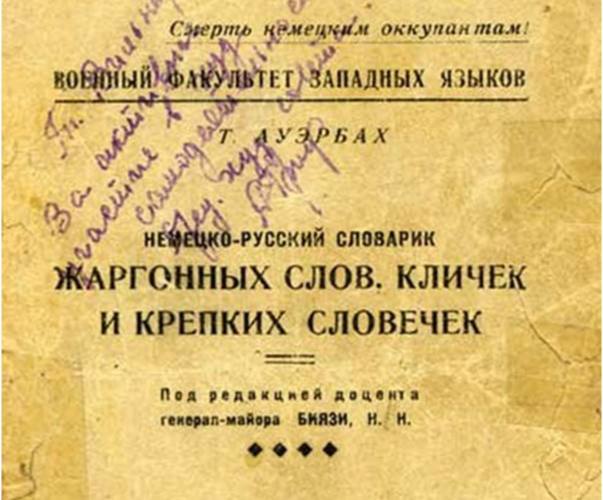 Куда в военное время без крепкого словца? Советские солдаты для их изучения пользовались «Немецко-русским словариком жаргонных слов, кличек и крепких словечек», составленным Т. Д. Ауэрбахом.