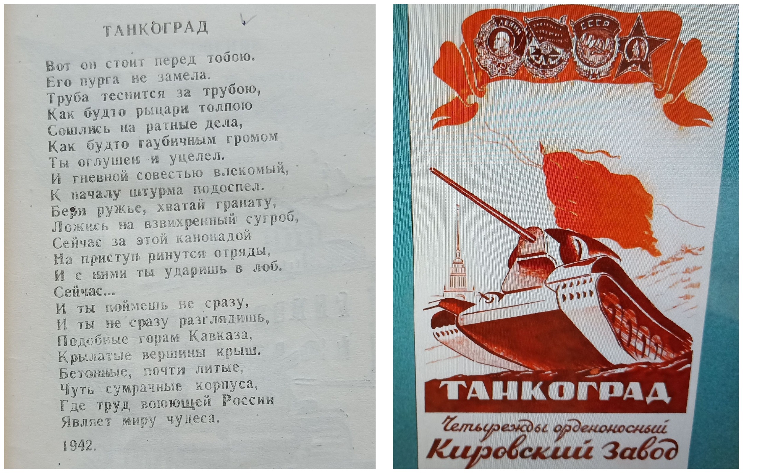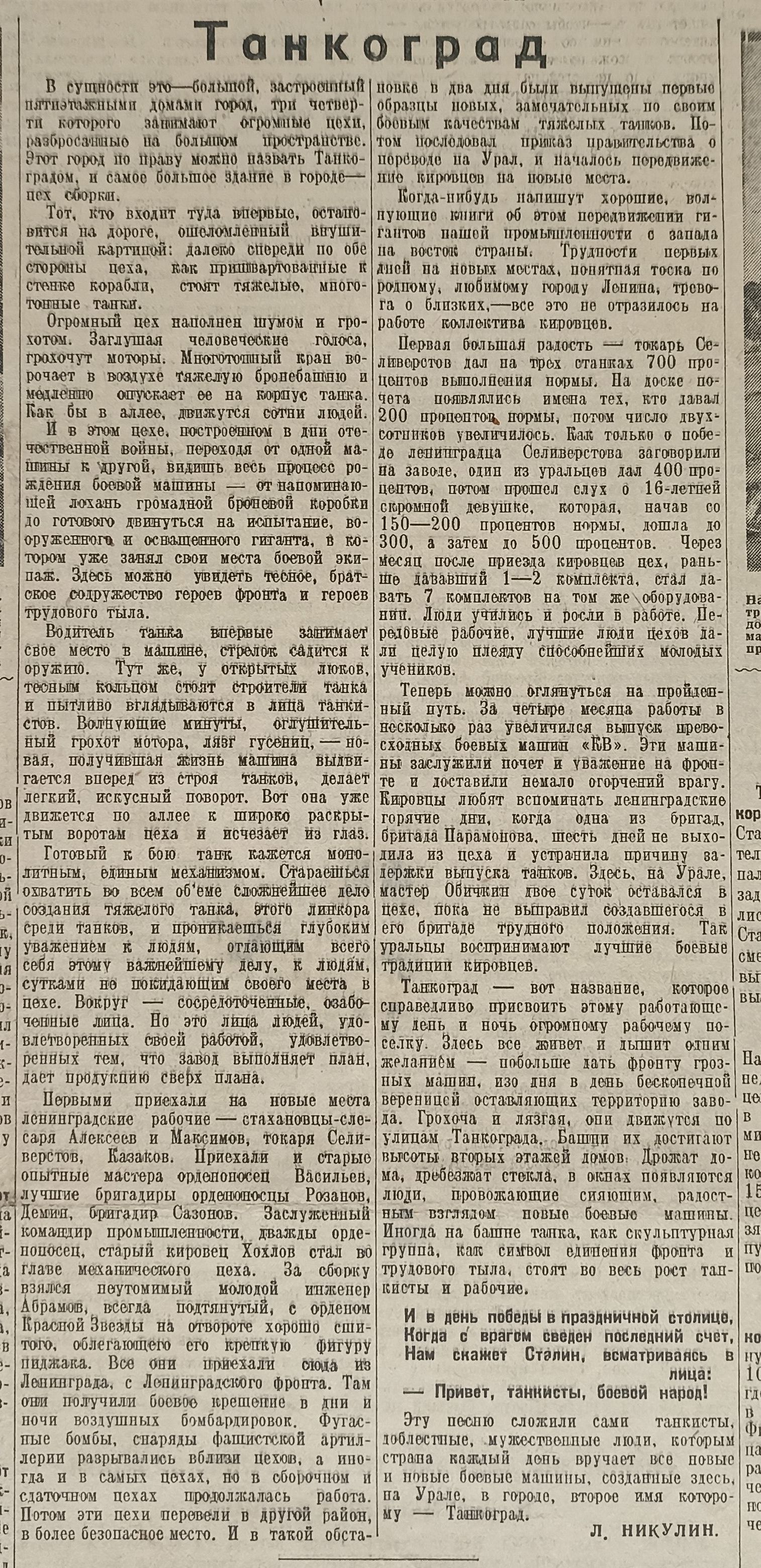 «Танкоград — вот название, которое справедливо присвоить этому работающему день и ночь огромному рабочему поселку. Здесь все живет и дышит одним желанием — побольше дать фронту грозных машин... Грохоча и лязгая они движутся по улицам Танкограда. Башни их достигают высоты вторых этажей домов. Дрожат дома, дребезжат стекла, в окнах появляются люди, провожающие сияющим, радостным взглядом новые боевые машины», — пишет Никулин.