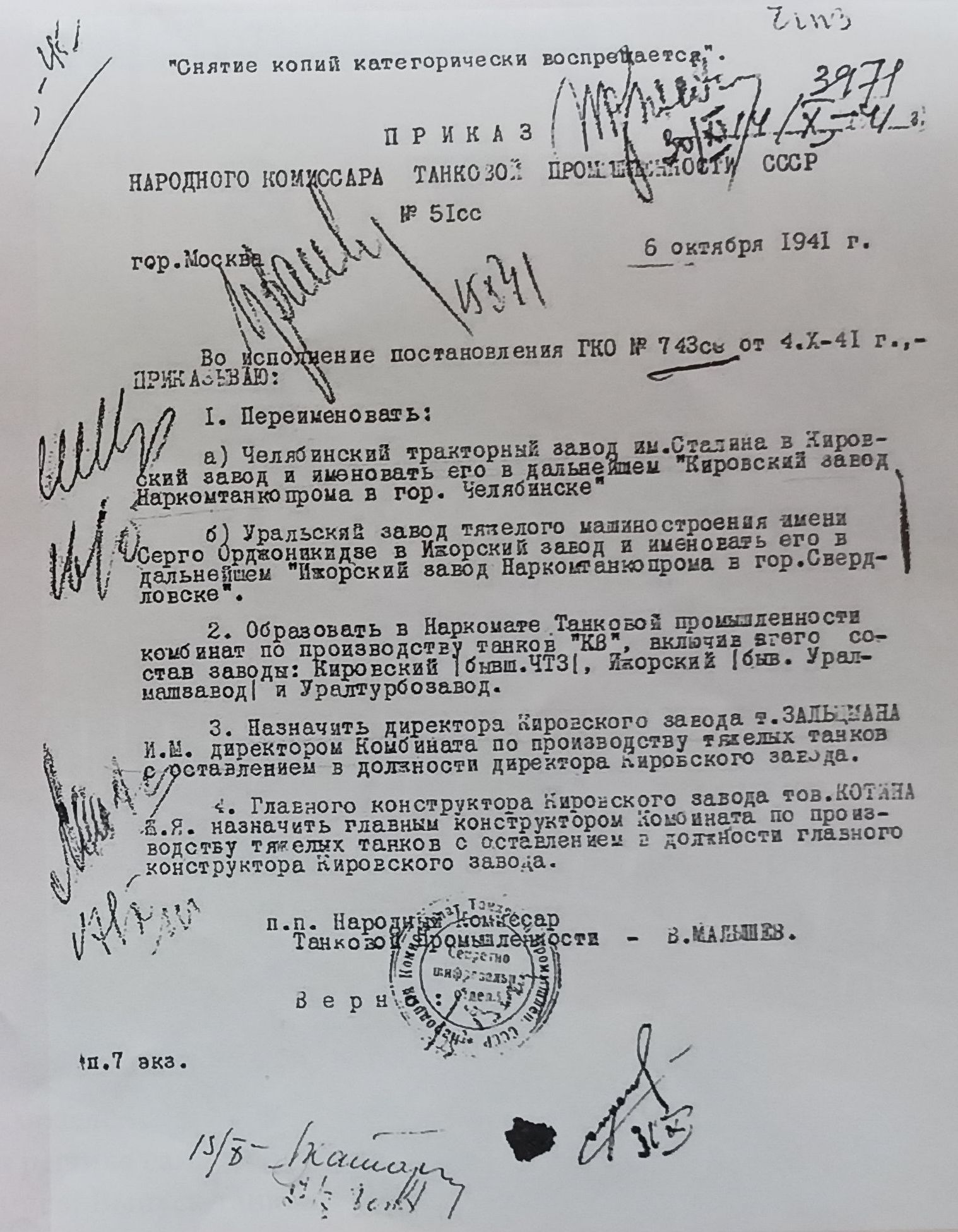Приказ народного комиссара танковой промышленности Малышева от 6 октября 1941 года о переименовании челябинского завода