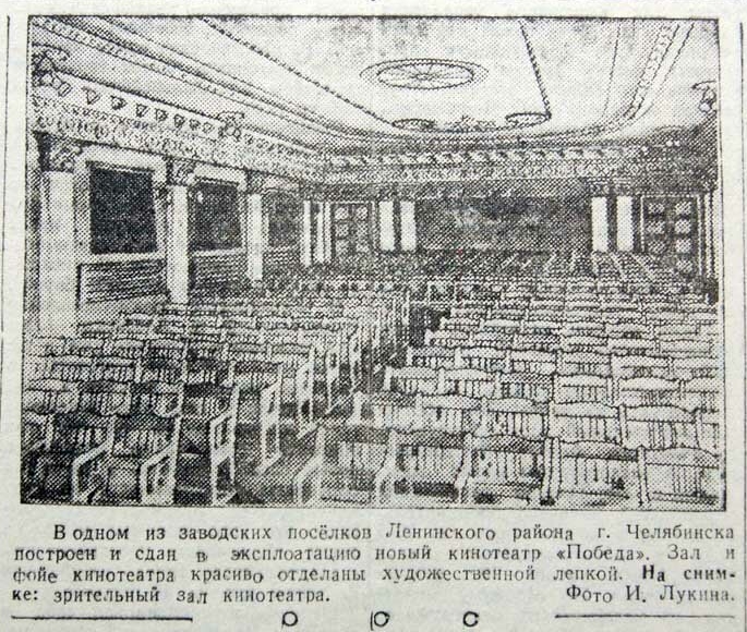 «В ознаменование 27-й годовщины Красной Армии в поселке завода металлоконструкций открыт кинотеатр на 210 мест. Театр построен коллективом завода за 46 дней. Здание театра отделано с большим вкусом. Новый театр — первый из 12 кинотеатров, которые должны быть построены в этом году в Челябинске по обязательству, данному товарищу Сталину»,— сообщал «Челябинский рабочий» 23 февраля.