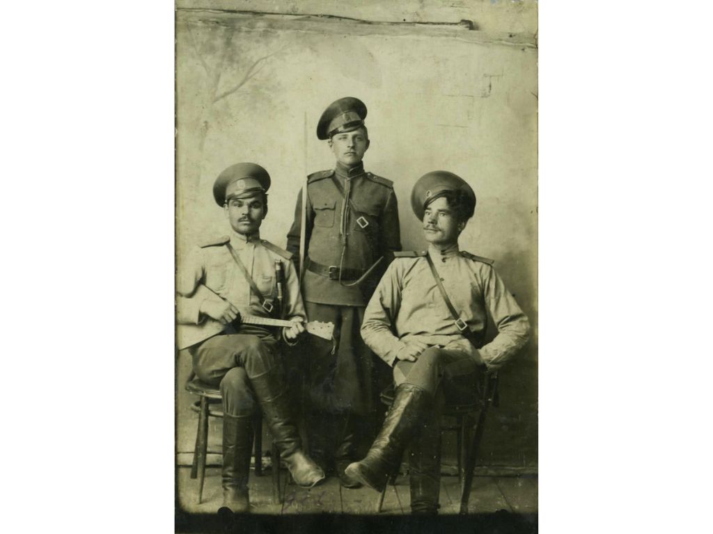 Фельдшер Оренбургского казачьего полка Василий Кузнецов (слева) с сослуживцами в 1916 году. Из архива С. Гусева, фото с портала ЧОУНБ «Литературная карта Челябинской области»