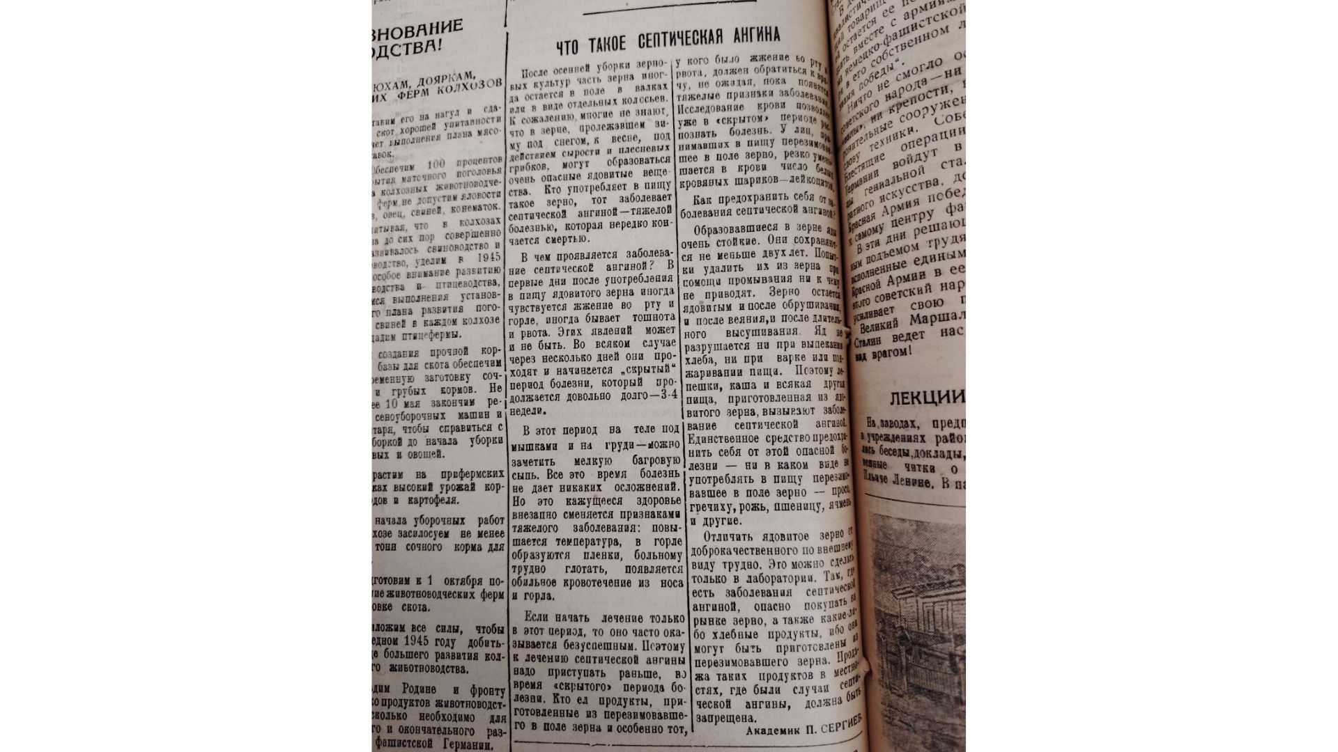 «Ученые-медики долго бились над тем, как найти противоядие от этой болезни. И только много лет спустя удалось выявить, что под септической ангиной скрывалась лейкопения — заболевание, связанное с отравлением кровеносной системы, а проще говоря, белокровие. Весной 1943 года от септической ангины умерло более 1500 человек в РСФСР и восточных областях Казахстана», — писала в монографии «Эвакуация в годы Великой Отечественной войны: люди и судьбы» Марина Потемкина.