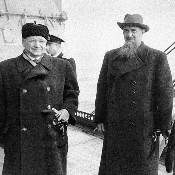 Академики И. В. Курчатов и А. Н. Туполев на борту крейсера «Орджоникидзе» отправляются в Великобританию в составе советской правительственной делегации