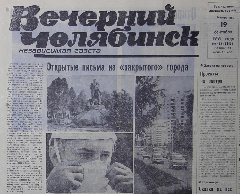В региональной прессе первый материал о Снежинске вышел 19 сентября 1991 года. Газета «Вечерний Челябинск» в том номере начала серию публикаций «Открытые письма из „закрытого“ города».