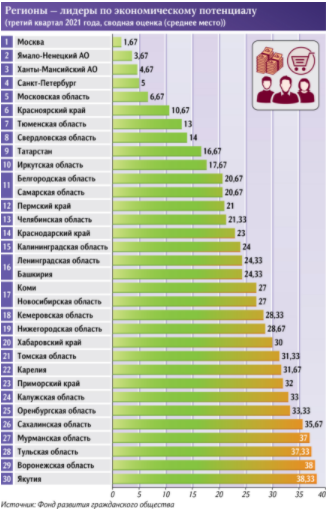 Первое место в рейтинге заняла Москва (1,7), второе — Ямало-Ненецкий автономный округ (3,7), третье — Ханты-Мансийский автономный округ (4,7). В конце списка оказались Республика Саха (38,3), Воронежская область (38) и Тульская область (37,3).