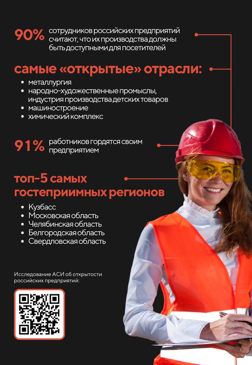 Опрос АСИ показал, что самыми открытыми отраслями являются металлургия, народно-художественные промыслы, производство детских товаров, машино- и станкостроение, химическая сфера. Неохотно организуют экскурсии судостроительные предприятия, фармацевтическая и медицинская промышленность, инновационные компании и производители строительных материалов.