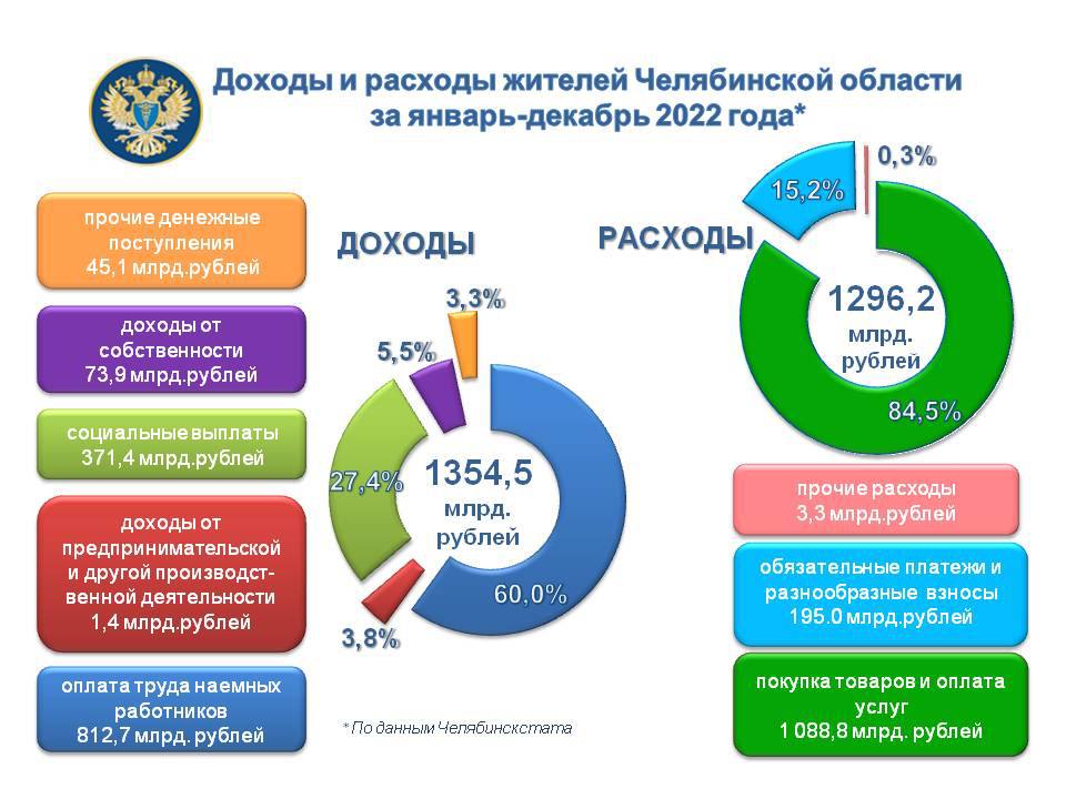 В 2022 году денежные доходы жителей Челябинской области составили 1,35 трлн рублей. Это на 11,5% больше, чем в 2021-м, сообщает Контрольно-счетная палата региона. Эксперты проводили анализ доходов и расходов. Траты, как выяснилось, выросли меньше.