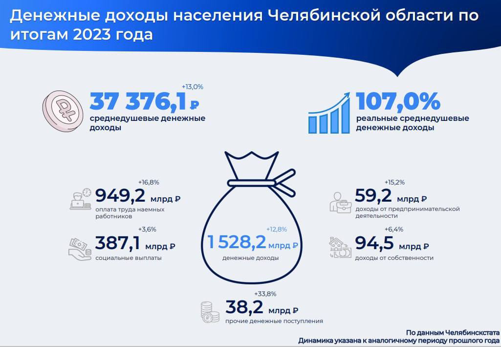 Денежные доходы жителей Челябинской области по итогам 2023 года увеличились на 12,8% по отношению к аналогичному периоду 2022 года и составили 1528,2 миллиарда рублей, сообщает пресс-служба Минэкономразвития Челябинской области.