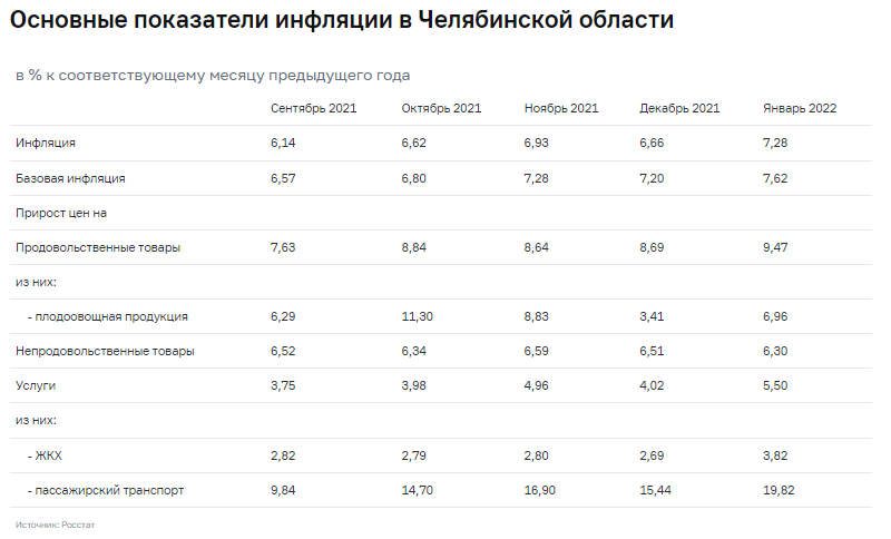 В январе годовая инфляция в Челябинской области ускорилась к декабрю 2021 года на 0,62 процентных пункта и достигла 7,28%. Это ниже общероссийского уровня инфляции (8,73%) и показателя в Свердловской области (8,2%). В соседнем регионе за месяц инфляция увеличилась на 0,09 п.п. В целом по Уральскому федеральному округу показатель находится на уровне 7,16%. Данные опубликованы отделением по Челябинской области Уральского ГУ Центробанка РФ.