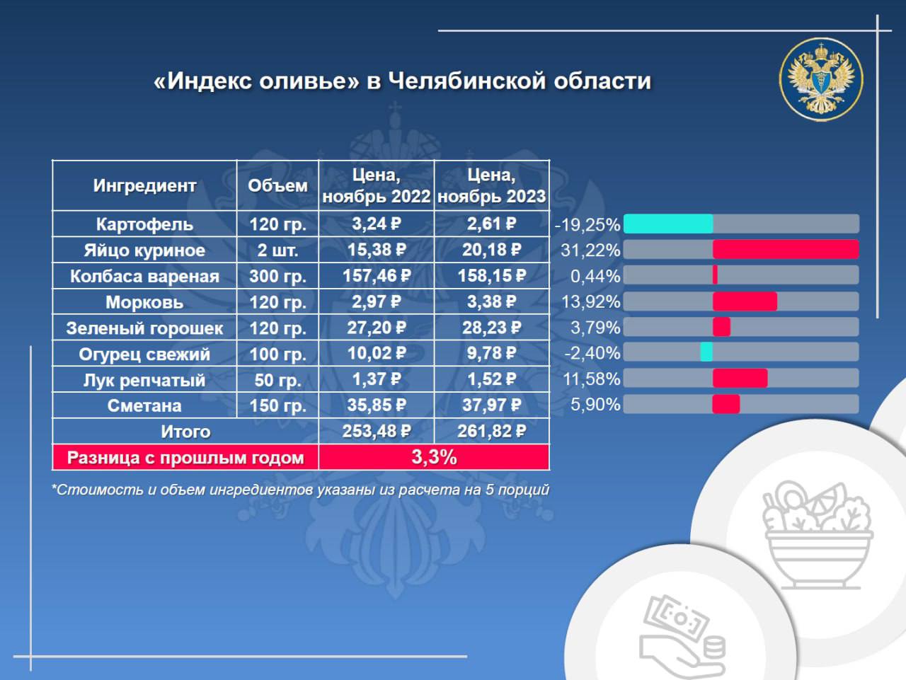 «Следует отметить, что за последние три года это минимальный скачок „индекса оливье“. Так, в 2020—2021 годах увеличение составляло 14%, а в 2021—2022 годах — 4%. При этом стоимость оливье выросла меньше, чем общая годовая инфляция в Челябинской области (+6,62%)», — отмечают в КСП.