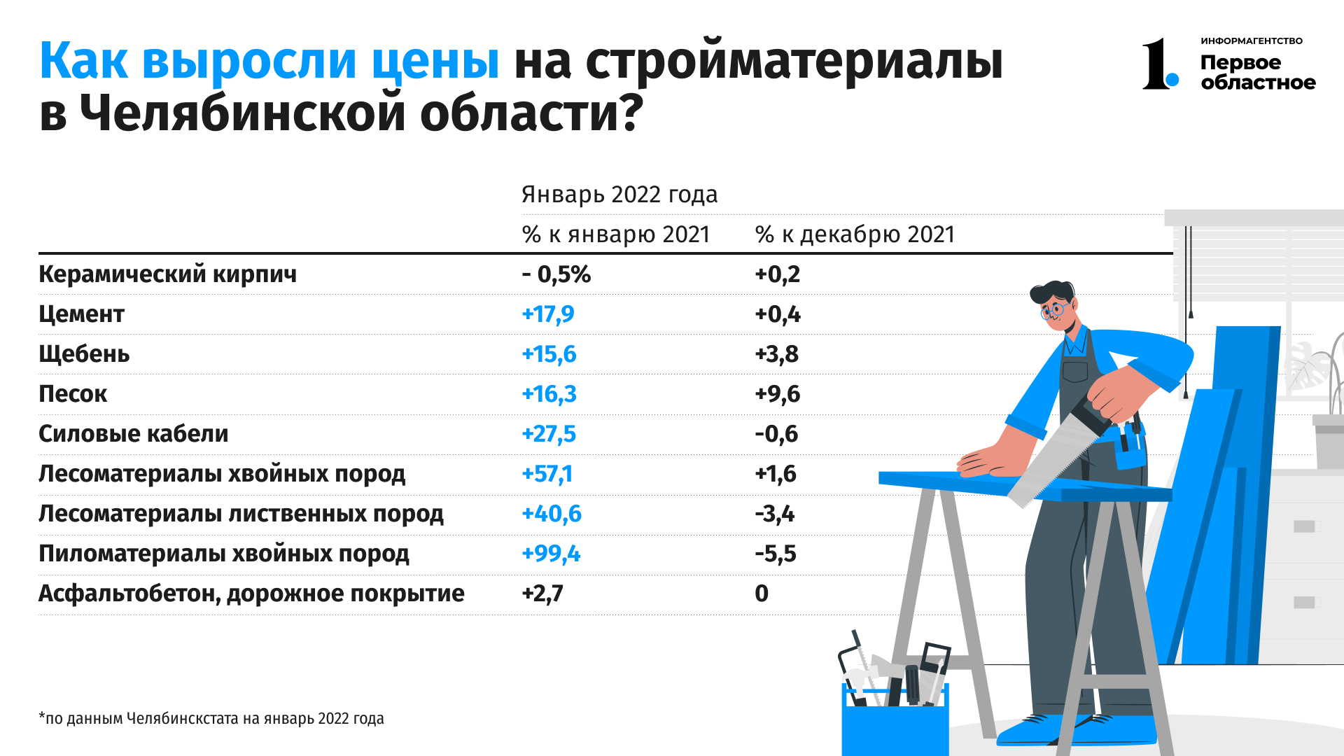 С началом строительного сезона стоимость стройматериалов традиционно дорожает на 10—15%. В этом году рост цен на некоторые категории стройматериалов фиксировался задолго до сезонных работ. По данным Челябинскстата, в январе 2022 года щебень подорожал на 15,6%, песок — на 16,3%, лесоматериалы (хвойные породы) — на 57,1%, кабель — на 27,5% к уровню прошлого года. Стоимость пиломатериалов и вовсе выросла в два раза.