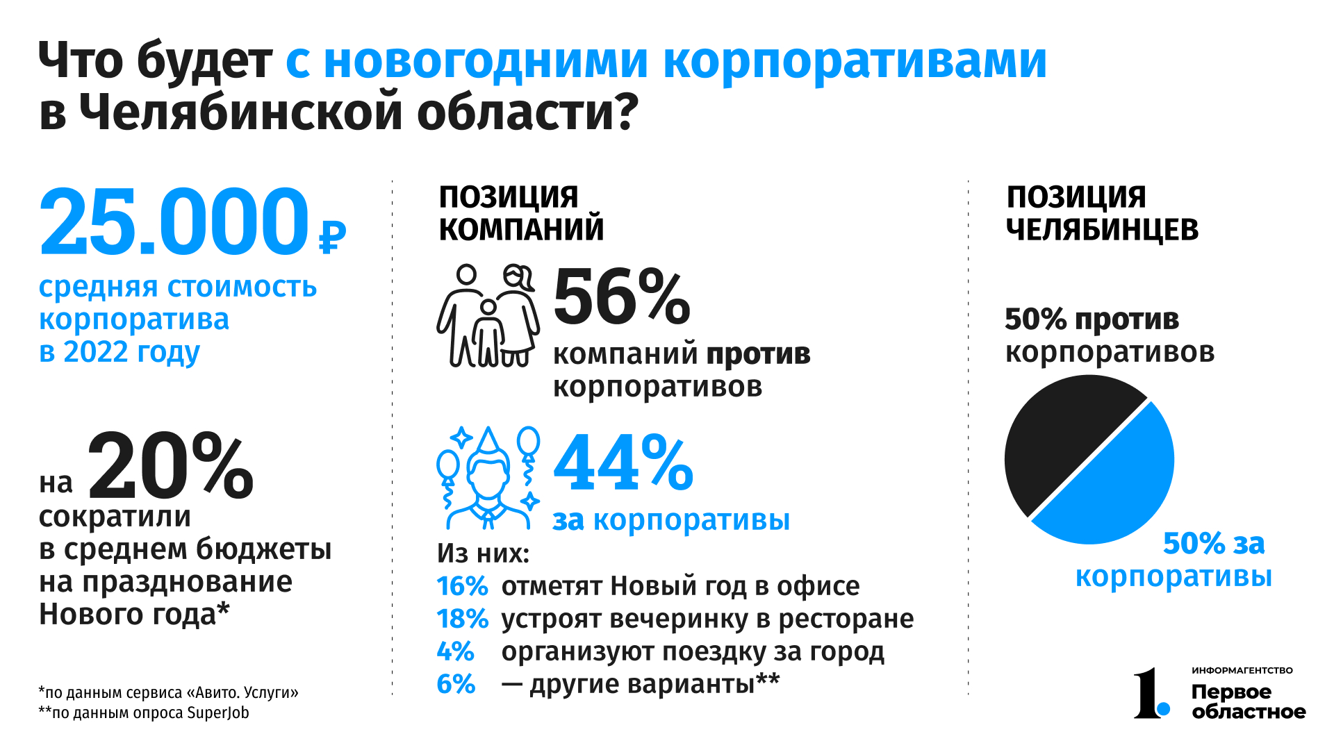 Согласно опросу менеджеров по персоналу челябинских компаний, который провел SuperJob, 6 из 10 работодателей не планируют проводить корпоративы. Из тех, кто собирается устроить праздник для сотрудников, 16% будут отмечать Новый год в офисе, еще 18% готовят вечеринку в ресторане, 4% планирует поездку за город.