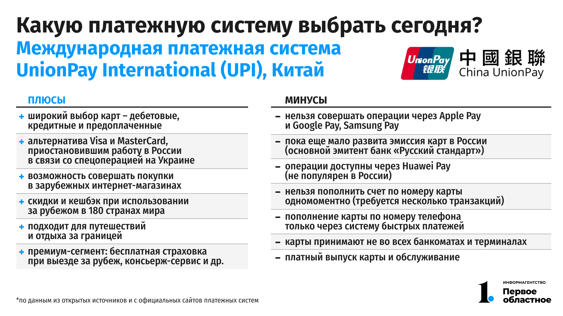 «Большие перспективы есть у развития в России китайской платежной системы UnionPay, которая стала чуть ли не единственной альтернативой западным сервисам — на рынке представлена давно, имеет высокую степень защищенности, ведется выпуск карт в России, но пока эмиссия не развита. Появляются новые банки-партнеры среди российских финансовых организаций, которые готовы сотрудничать с UnionPay и видят в этом только плюсы. Для пользователей, среди которых много путешественников и любителей зарубежного отдыха, это тоже отличный вариант, поскольку предоставляются существенные скидки»,— говорят финансовые аналитики.