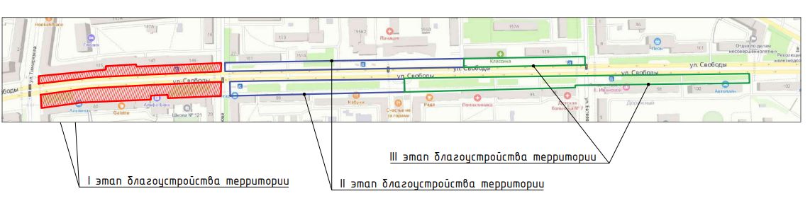 Подрядчик должен будет уложить плитку, оборудовать водостоки, установить указатели и рекламную тумбу, ограждения и парковочные столбики. Также на улице Свободы поставят новые скамьи, уличные кресла, велопарковки, высадят липы, сирень, жимолость, рябинник и кизильник. Обновят и освещение. Демонтаж асфальта, плитки и старых урн проведут в апреле-мае. Малые архитектурные формы установят в июне-июле. Озеленение проведут в июле. Гарантийный срок на выполненные работы составляет 36 месяцев.