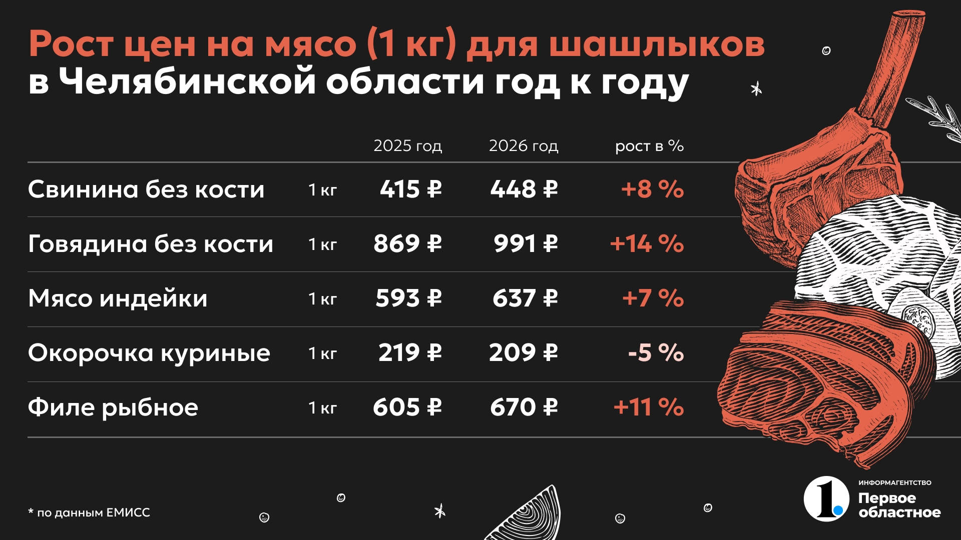 Самый дорогой шашлык будет из говядины, поскольку килограмм бескостного мяса стоит более 990 рублей (+14% за год). Самый бюджетный вариант — это приготовить шашлык из курицы, поскольку цена за год даже снизилась на 5%. Куриные окорочка продаются в рознице по цене 208 рублей за кило. Альтернативным вариантом для любителей птицы может стать индейка, но цена будет в 3 раза дороже (от 630 рублей за кило). Филе рыбы можно приобрести по цене от 670 рублей за кило, но если вы выберете красную рыбу (горбушу, семгу, форель), то стоимость шашлыка автоматически вырастет в 2—3 раза.