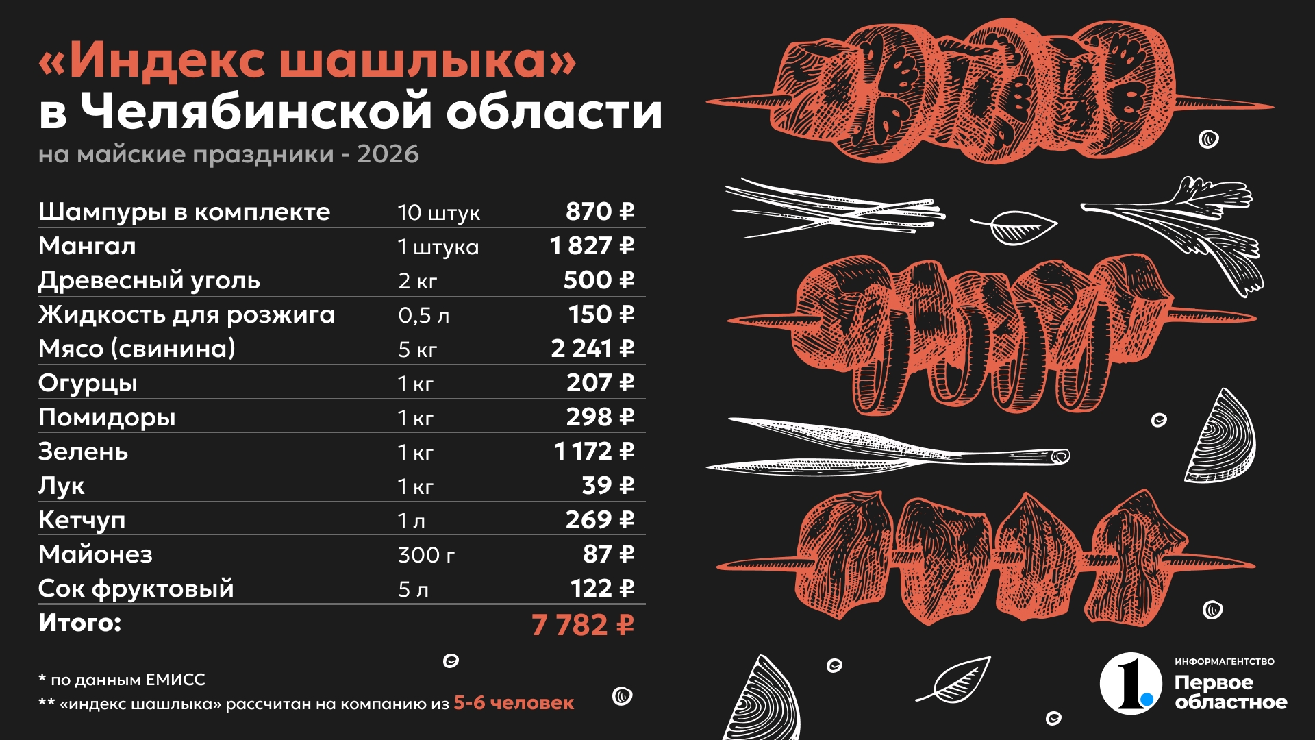 Один из самых популярных видов отдыха на майские праздники — выезд на природу с приготовлением шашлыка. В этом году пикник обойдется в 7,8 тысячи рублей для компании из 5—6 человек. Это на 3% дороже, чем в прошлом году. Корреспондент ИА «Первое областное» подсчитала «индекс шашлыка», чтобы узнать, на что выросли траты за год.