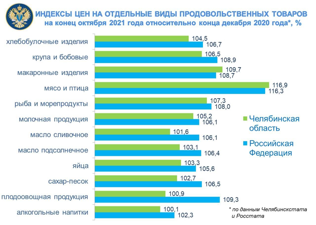 С января по ноябрь текущего года индекс цен на продовольственные товары в Челябинской области увеличился на 7% относительно января — ноября прошлого года. В среднем по России прирост составил 8,6%. Данные опубликовала Контрольно-счетная палата региона со ссылкой на Челябинскстат и Росстат.