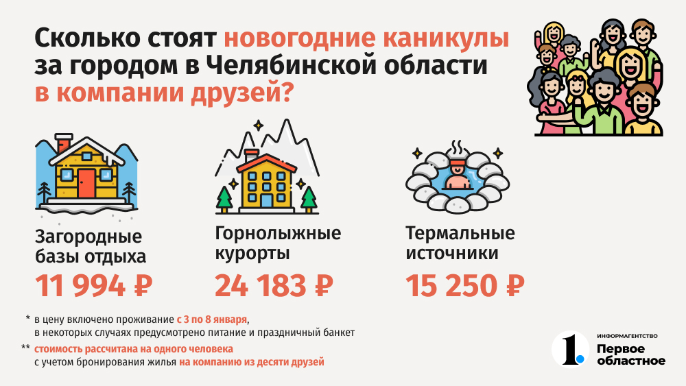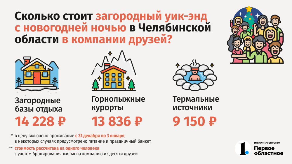 ИА «Первое областное» рассчитало прайс для большой компании из десяти человек и среднестатистической семьи из четырех человек. Мы предусмотрели два сценария отдыха — встретить Новый год и провести за городом уик-энд (с 31 декабря по 3 января) или отметить праздник дома, а на природе провести все каникулы (с 3 по 8 января).