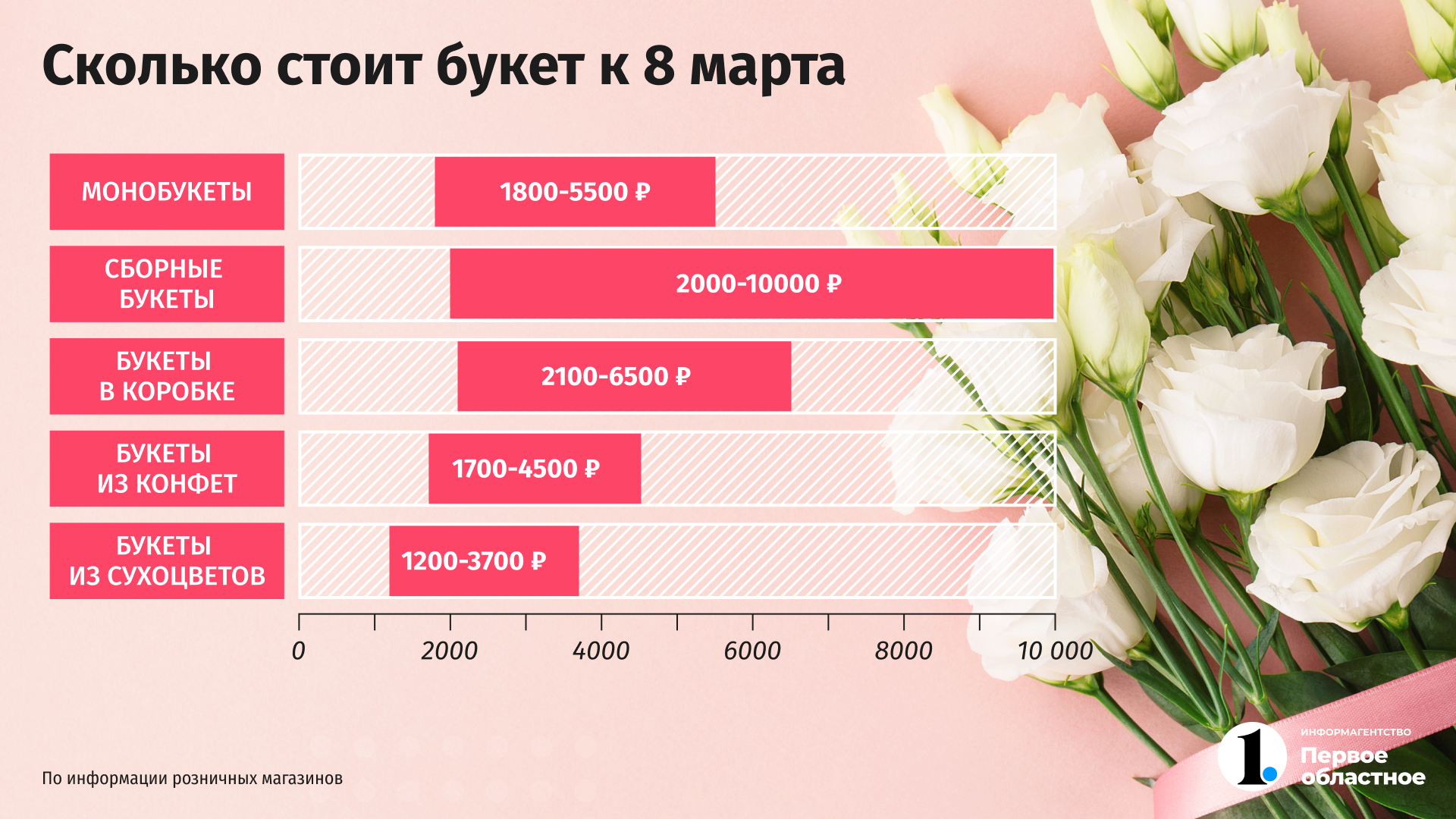 Как рассказали ИА «Первое областное» представители цветочного бизнеса, некоторые растения значительно подорожали из-за санкций, цены на другие удалось снизить благодаря импортозамещению. В среднем стоимость букетов выросла на 30%, говорит соосновательница цветочной лавки Lavandysh Елена Панарина. При этом спрос 7—8 марта вырастет в 2—3 раза по сравнению с обычными днями.