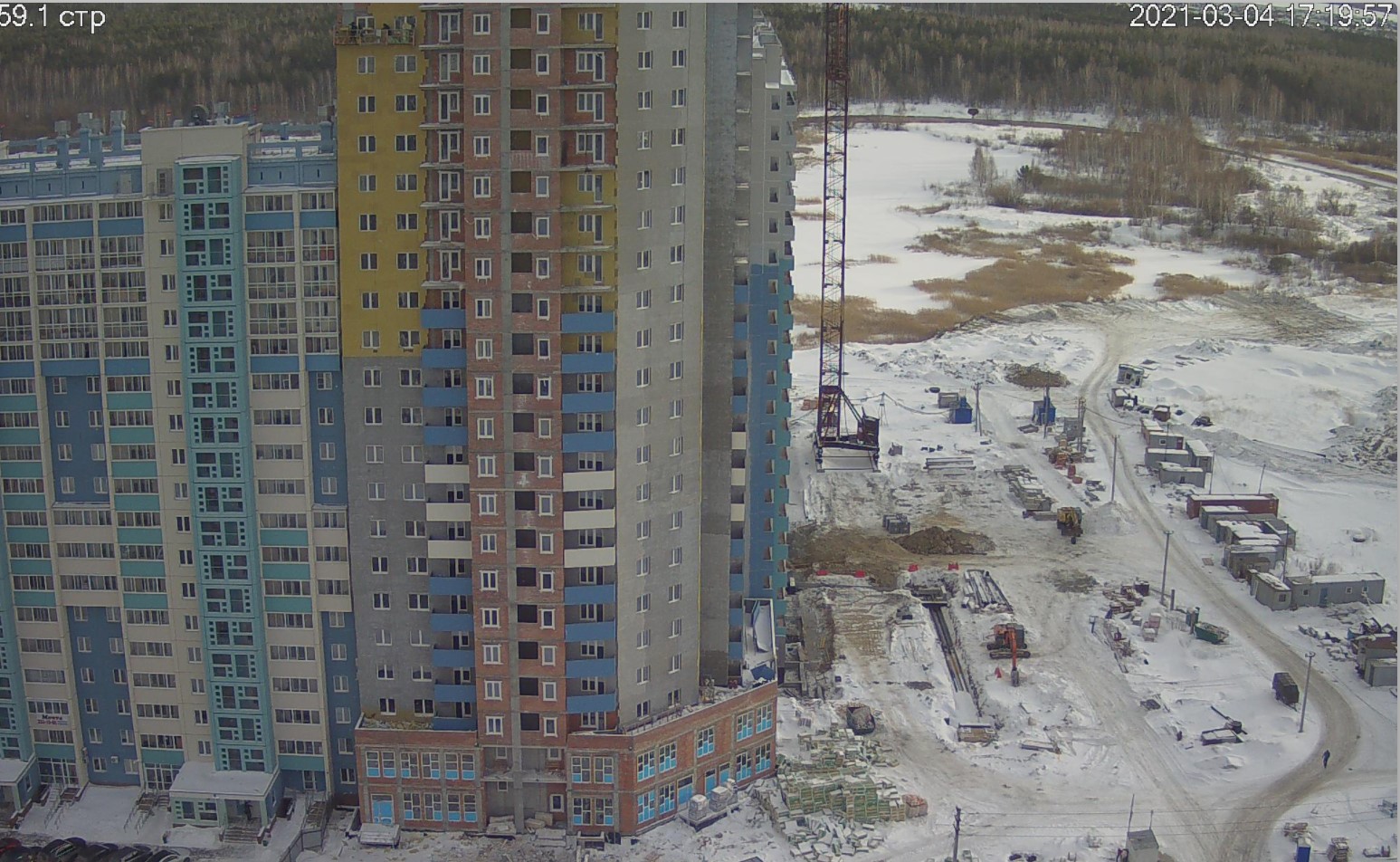 В микрорайоне Академ Riverside продолжается строительство высотки № 59.1. Судя по кадрам с камеры наблюдения, объект находится в высокой степени готовности.