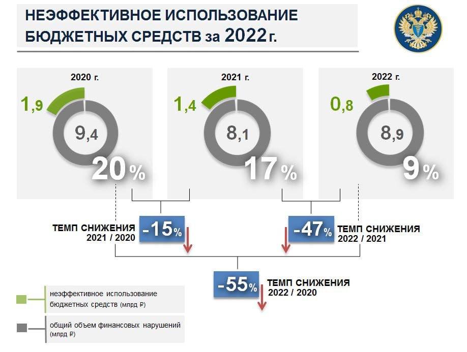 На рост эффективности повлияла работа с объектами незавершенного строительства. Если в 2020 году объем нарушений в этой сфере составлял 1313,7 млн рублей, то в 2021 году — 769,4 млн рублей, в 2022 году — 507,2 млн рублей.