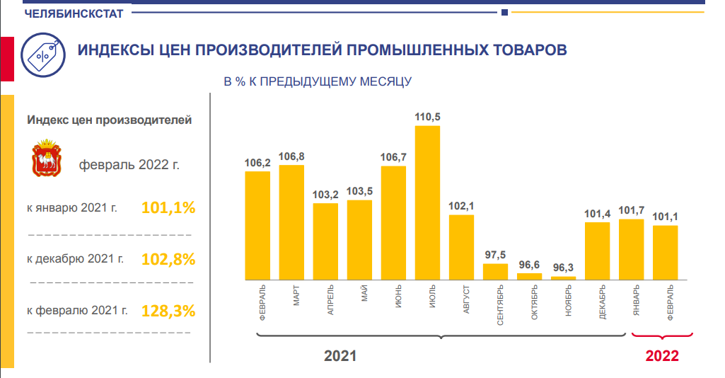 Вместе с тем в Челябинской области почти на треть вырос индекс цен производителей промышленных товаров. В феврале 2022 года к февралю 2021-го показатель увеличился на 28,3%.