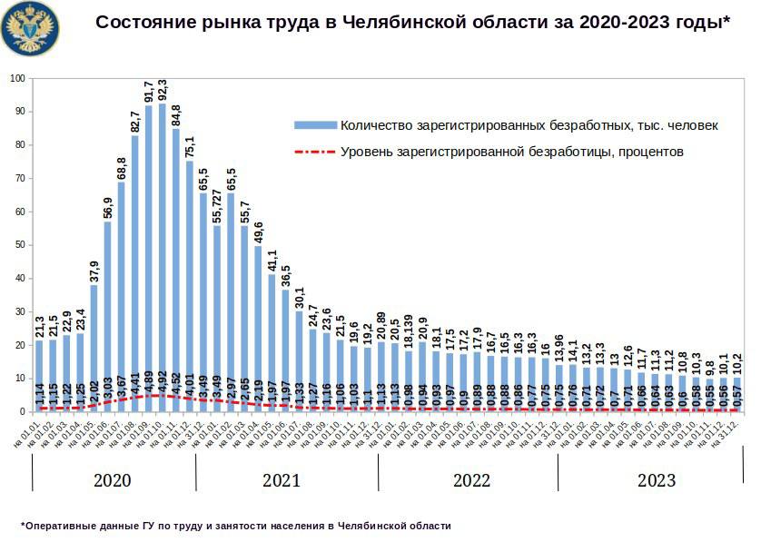 По данным на 31 декабря 2023 года, в Челябинской области количество зарегистрированных безработных составило 10,2 тысячи человек, в 2022 году — 13,96 тысячи, в 2021 году — 20,89 тысячи, в 2020 году — 65,5 тысячи.