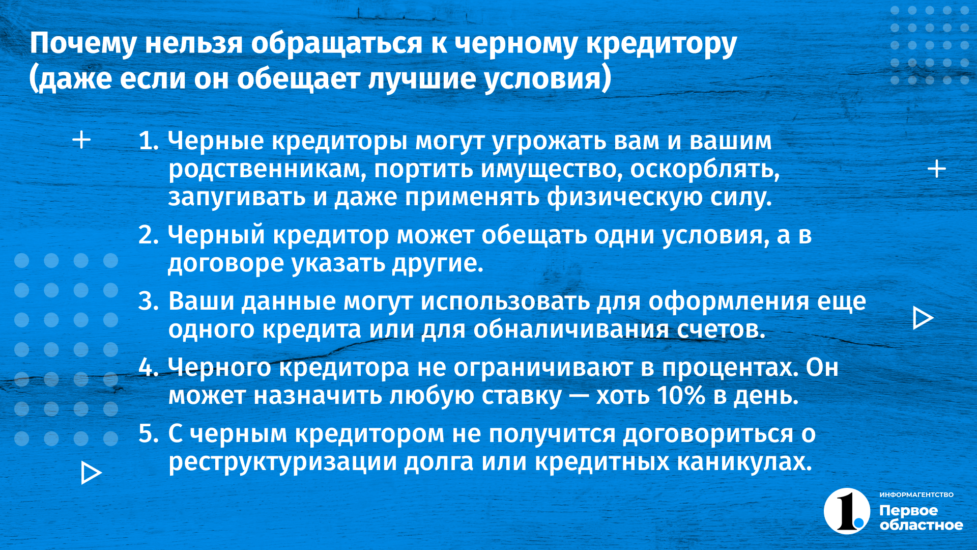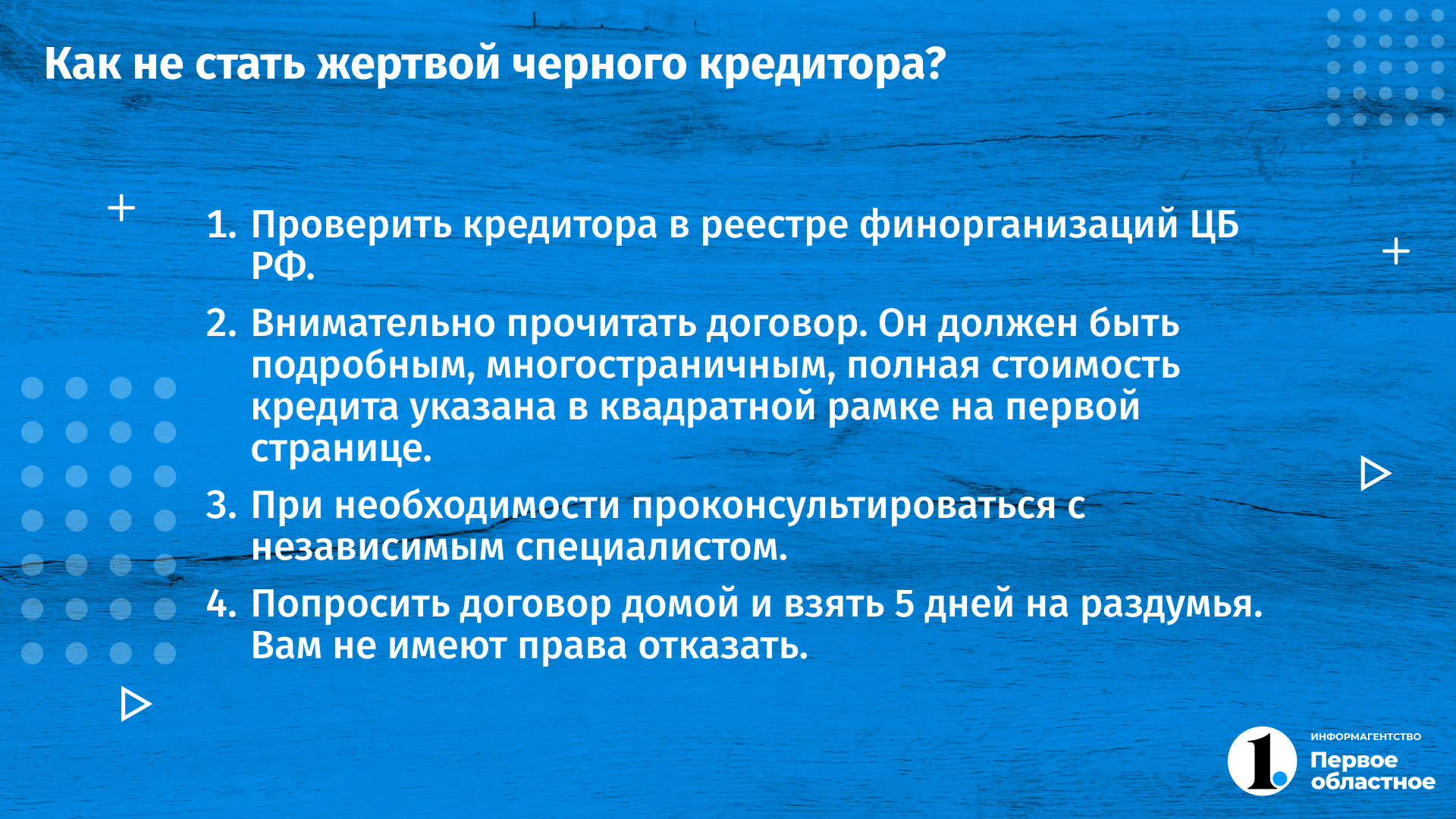 «Черные кредиторы», как правило, маскируются под ломбарды, комиссионные и ювелирные магазины, микрофинансовые компании, магазины по ремонту техники, салоны автопроката. Они выдают людям деньги на своих условиях, не имея на это лицензий. ИА «Первое областное» подробно рассказывало, как не стать жертвой мошенников и что делать, если ваши близкие попались на уловки «черных кредиторов».