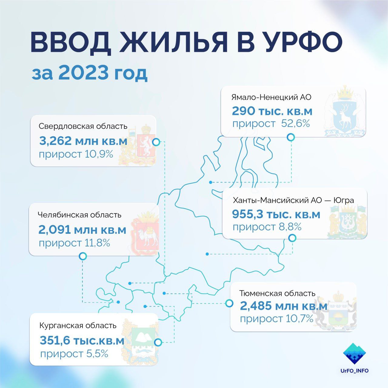 В Челябинской области в 2023 году введено в эксплуатацию 2 миллиона квадратных метров жилья. В Свердловской области построено 3,3 миллиона квадратных метров, в Тюменской — 2,5 миллиона квадратных метров.