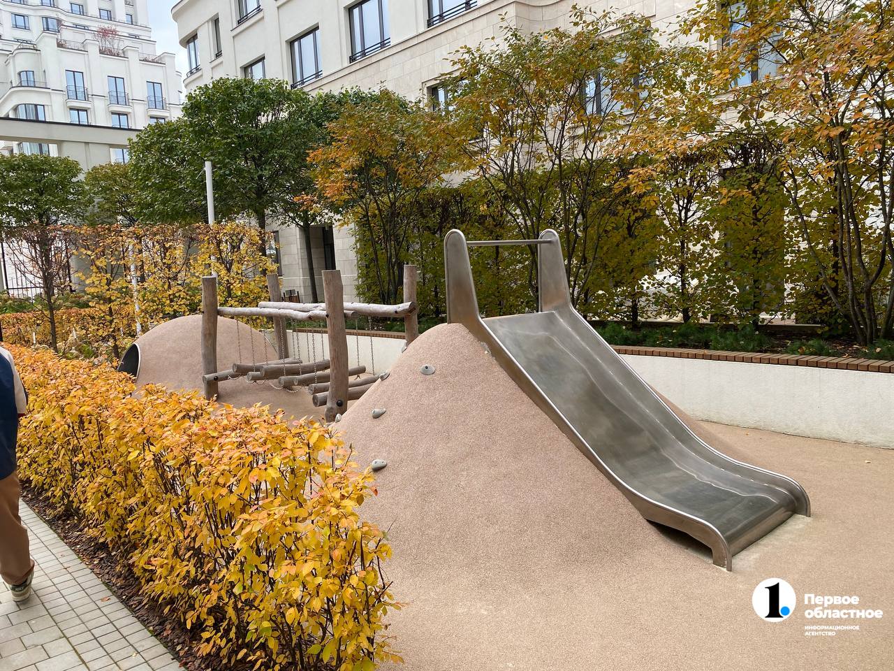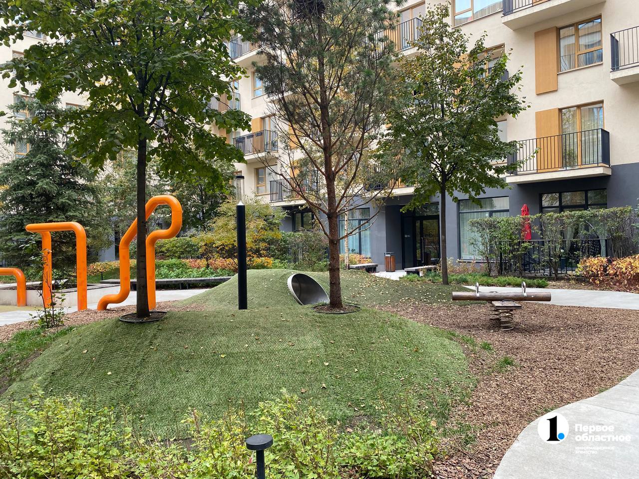 Еще один из принципов и особенность застройки — создание «леса во дворе». Используется пять уровней озеленения (газон, кусты разной высоты и деревья), также учитывается сезонность растительности, чтобы за окном как можно дольше наблюдать зелень.