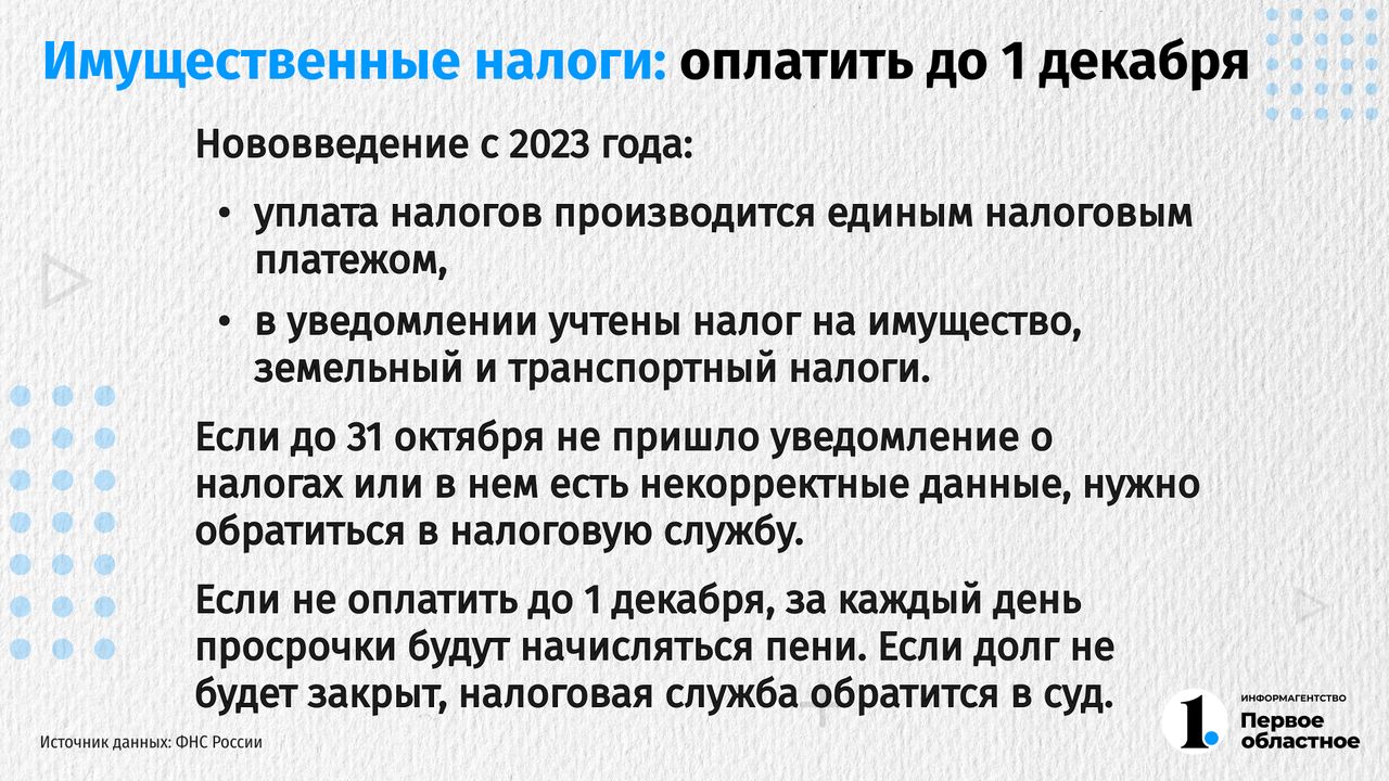 С 2023 года уплата налогов производится единым налоговым платежом по указанным в уведомлении реквизитам. Там учтены налог на имущество, земельный и транспортный налоги. Если не оплатить до 1 декабря, за каждый день просрочки будут начисляться пени. Если долг не закрыть, налоговая служба обратится в суд, после чего взысканием займутся приставы.